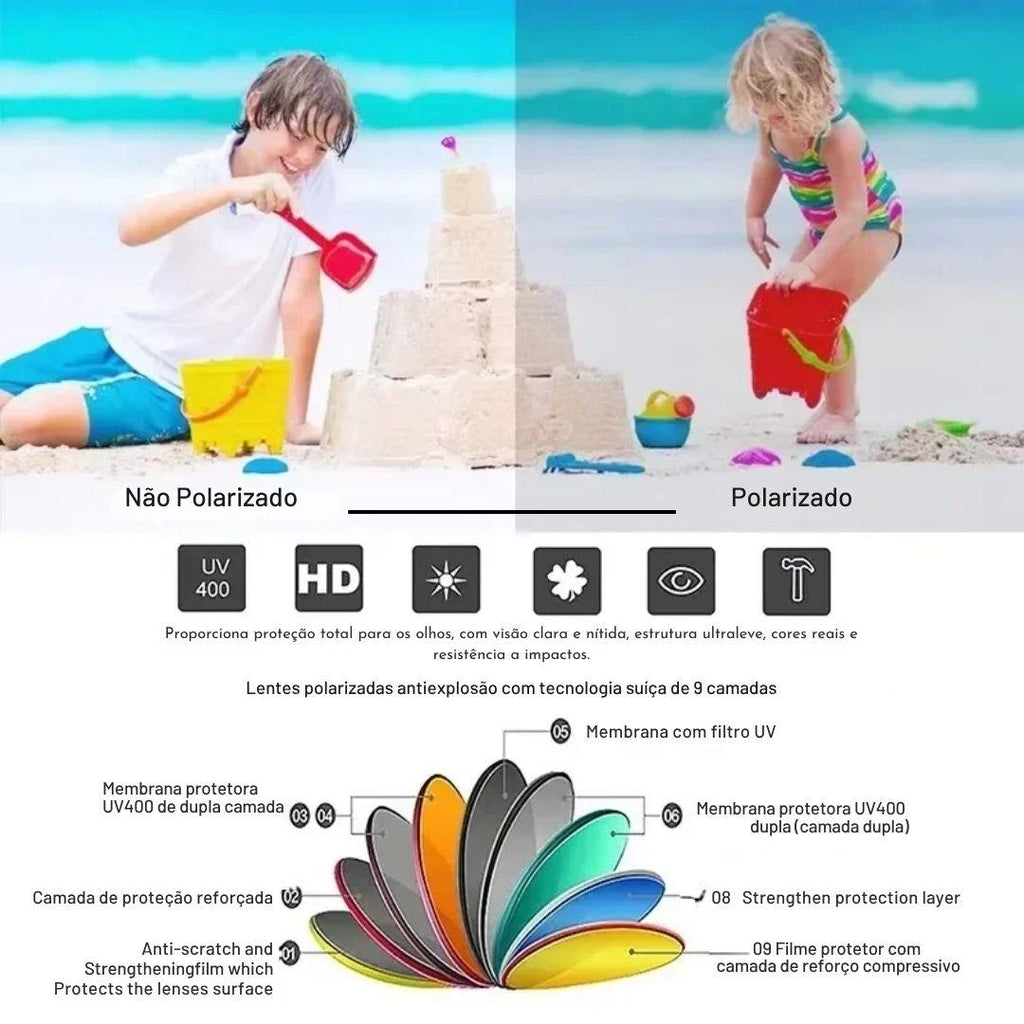 As lentes Polaroid com tecnologia UV400 bloqueiam 100% dos raios UVA e UVB, protegendo os olhos sensíveis do bebê contra o sol e reflexos.